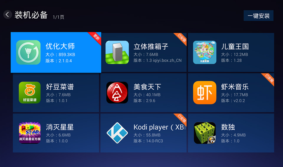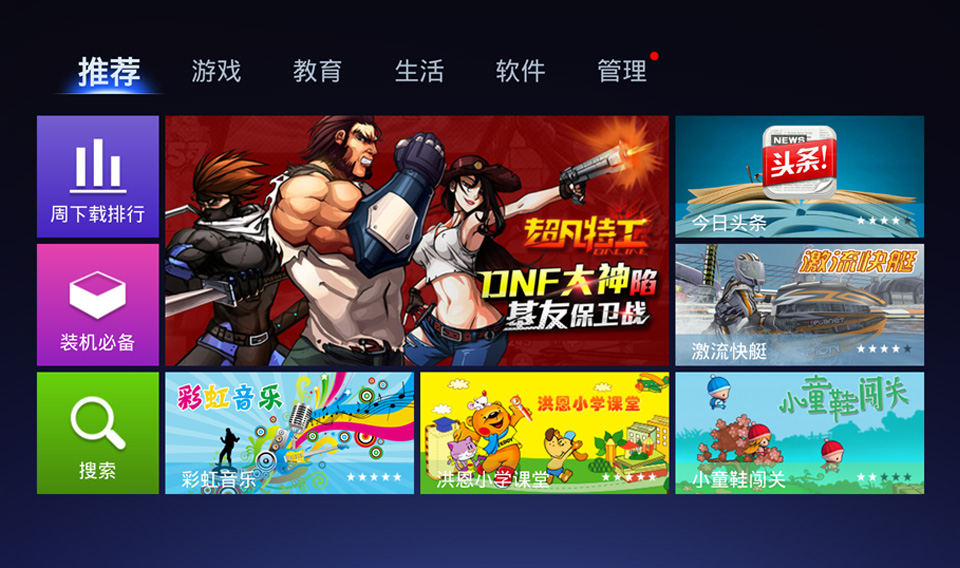 由两大部分组成,一部分是左侧的三个固定类目,包括周下载排行,装机必备和搜索。